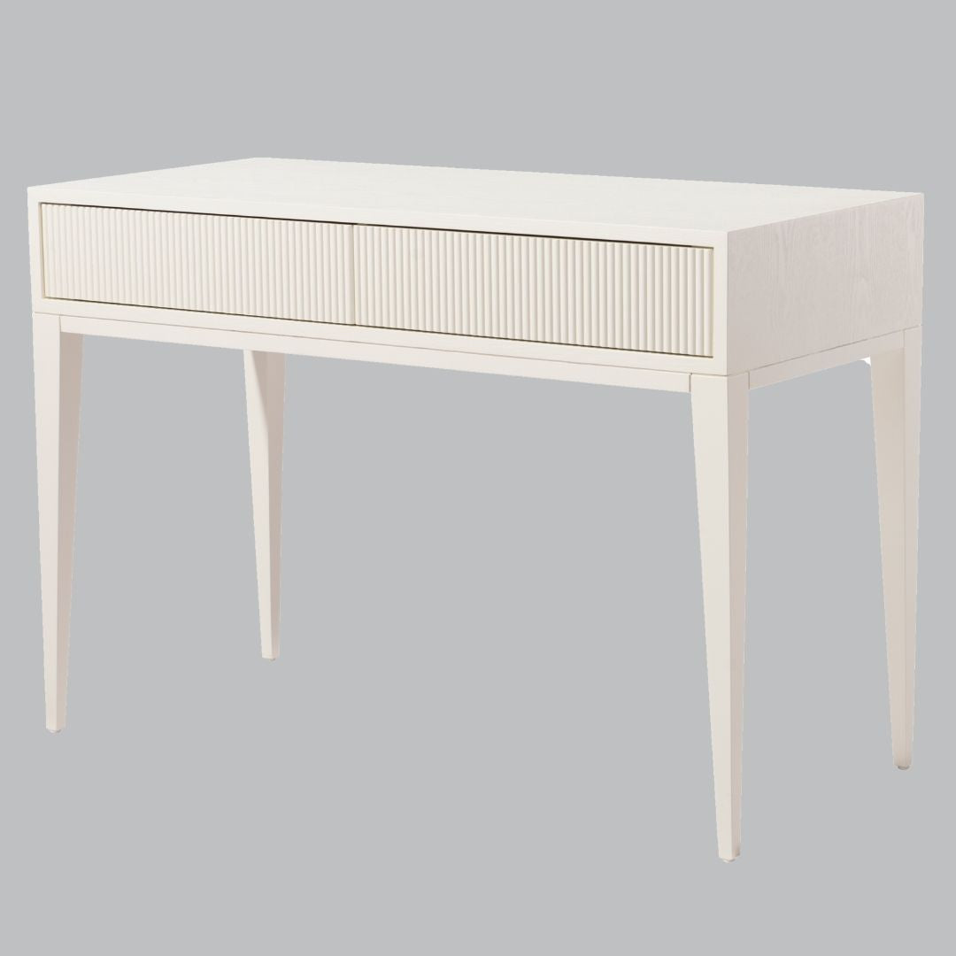 The Asha Dressing Table, available in a sophisticated white or light grey finish, brings a timeless, classic look to any interior. Featuring two drawers with an exquisite pattern design and charming tapered legs, this piece is perfect for adding a touch of elegance and femininity to a room. Pair it with one of our mirrors and a matching dressing table stool to create a chic and stylish focal point, ideal for any bedroom or dressing area.