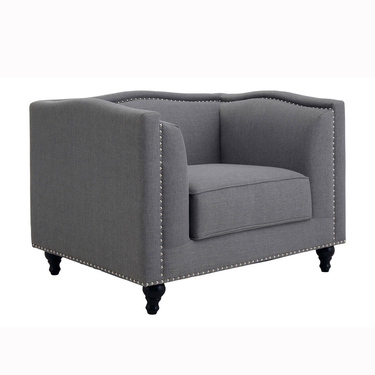 The Astrid Accent Chair is a stylish and comfortable seating option. It features a plush fabric upholstery, accented by silver stud detailing along the edges.
