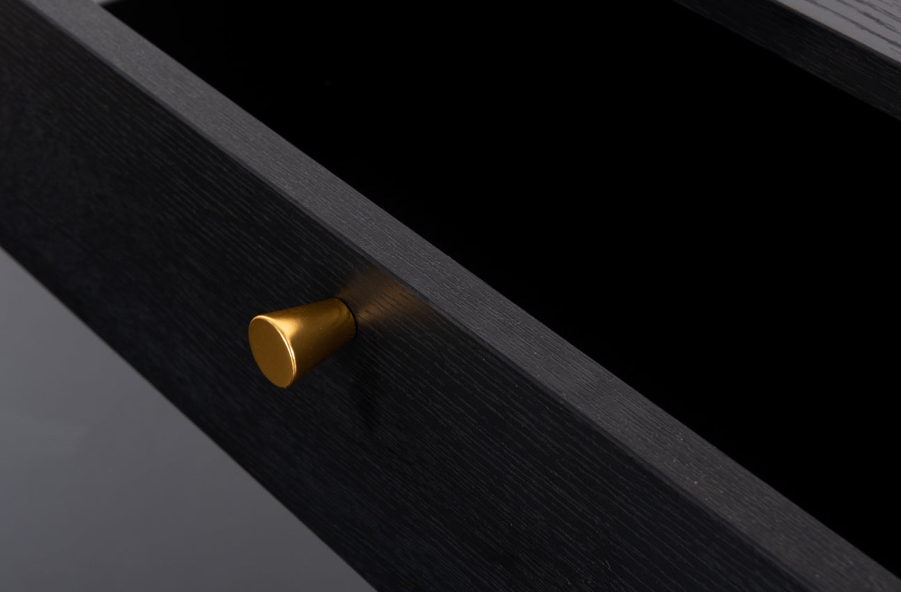 Black oak melamine, powder-coated black metal legs, copper metal accents.