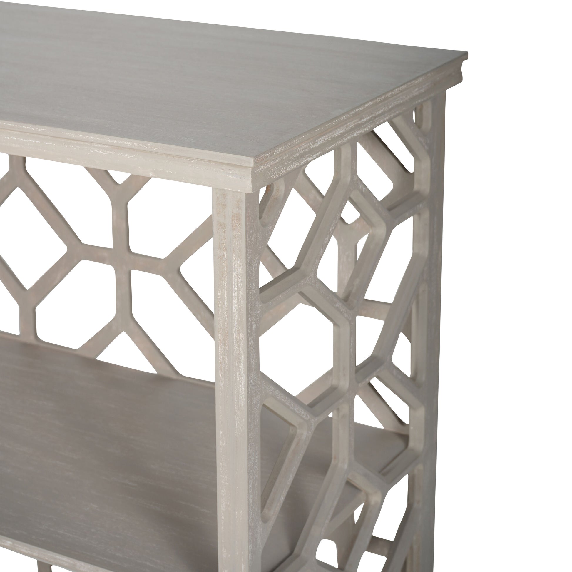 The Carter Open Shelving Unit with Distressed Finish combines solid wood construction with hand-carved panels for a touch of rustic elegance.