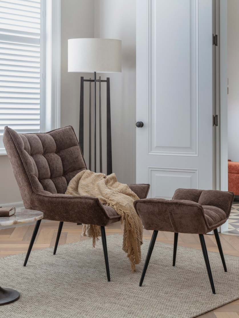 The Christina Lounge Chair with Footstool brings retro-inspired comfort and bold character to your space. Upholstered in a soft and textured brown chenille, this striking chair features a relaxed, curved silhouette with a matching footstool for elevated comfort.