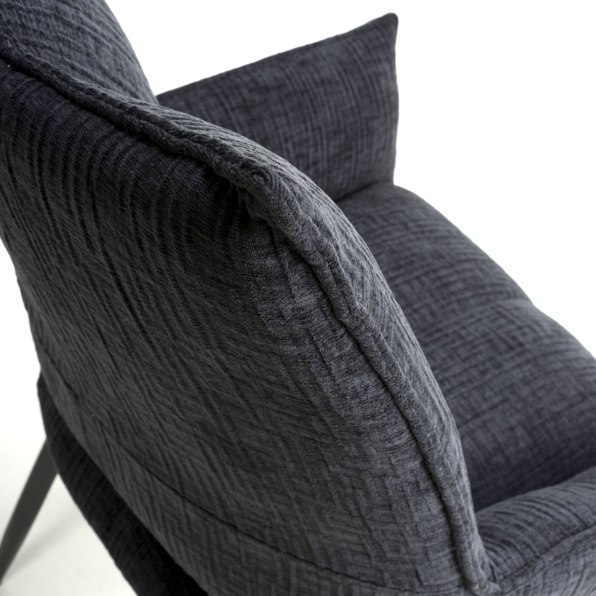 The plush charcoal upholstery, featuring a subtle textured weave, adds both comfort and visual interest. This chair effortlessly swivels 180 degrees, making it perfect for easy conversation and movement.