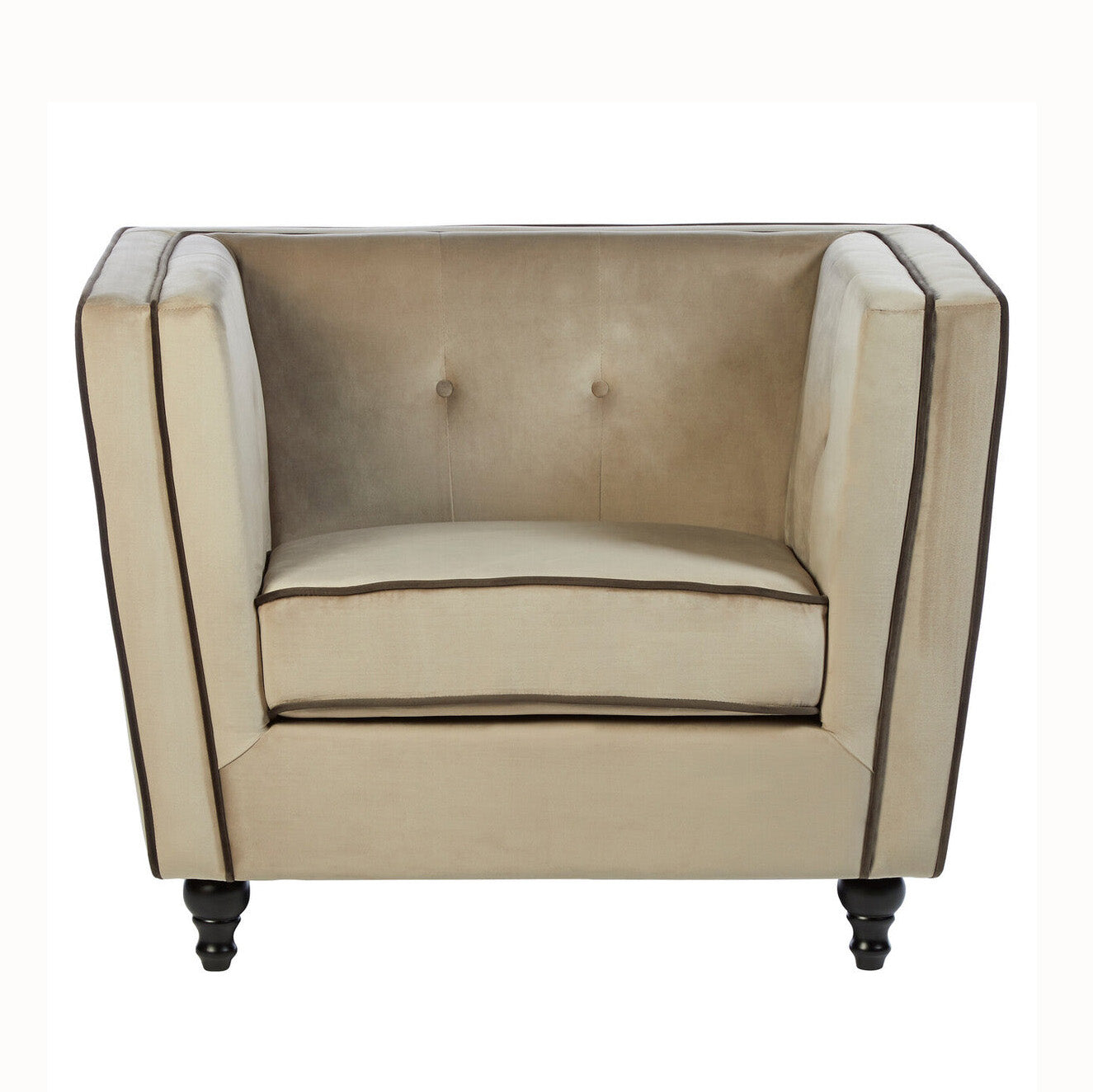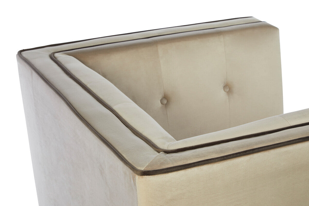 The Elysian Mink Velvet Chair features upholstered luxurious mink velvet and a sleek tuxedo design with a back that is level with its armrests. The brown piping elegantly accentuates the chair's clean lines and angular silhouette.