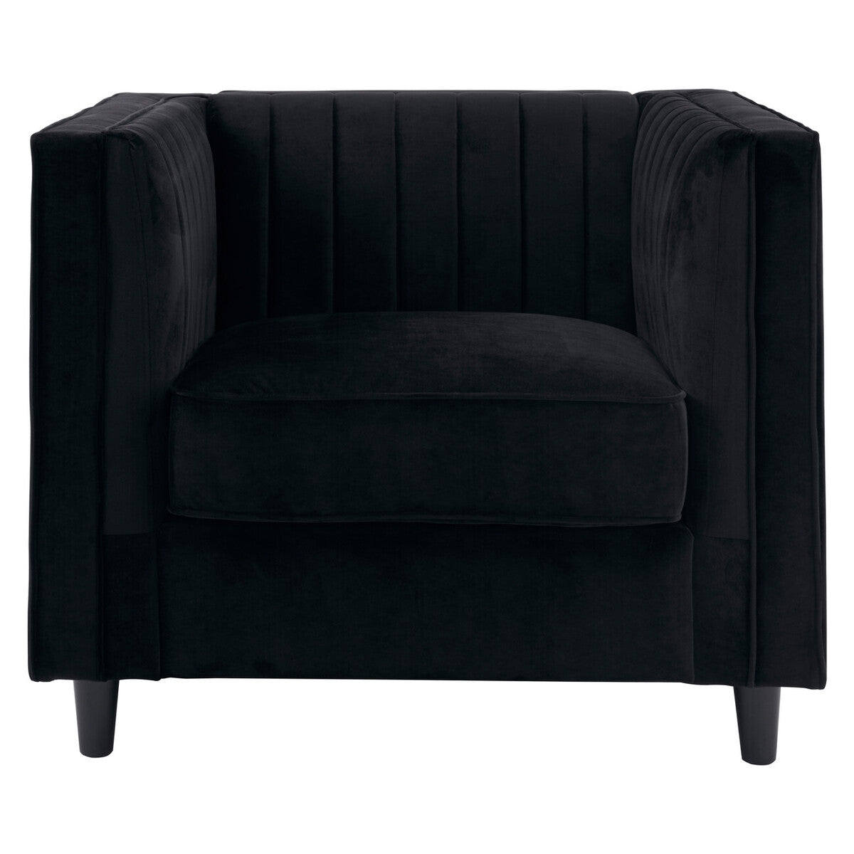 The Farhan Velvet Chair is a contemporary piece with a luxurious touch. Its clean, square silhouette and pleated back and armrests create an understated elegance, while the Black or Grey velvet upholstery adds depth and richness.