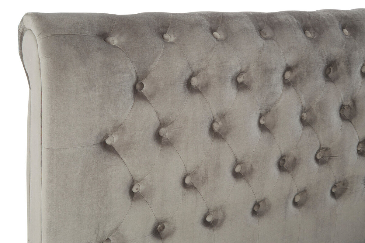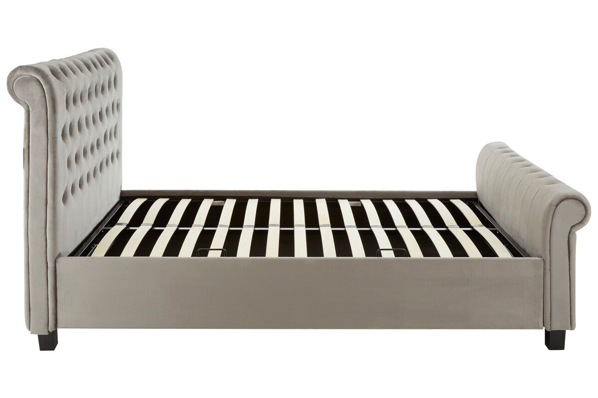 Make a grand statement in your bedroom with the Florida Kingsize Ottoman Bed, where traditional elegance meets practical design. Upholstered in plush light grey brushed velvet, this standout piece features a classic rolled headboard and footboard, detailed with deep diamond button tufting for a truly sophisticated finish.