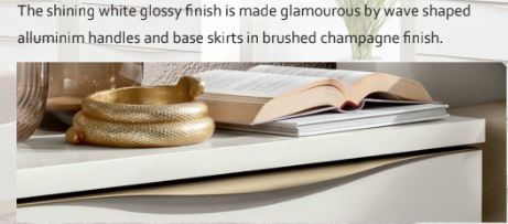 Featuring the KIKI White hi-gloss 3 or 6 Draw Dressing Table in white hi-gloss with a stunning Champagne base, also available in Maxi size. The sleek white glossy finish is beautifully accented with wave-shaped aluminium handles and base skirts in a brushed champagne finish, adding a touch of glamour to any bedroom. The drawers are lined with a durable anti-scratch material, and all operate on smooth soft closing guides.