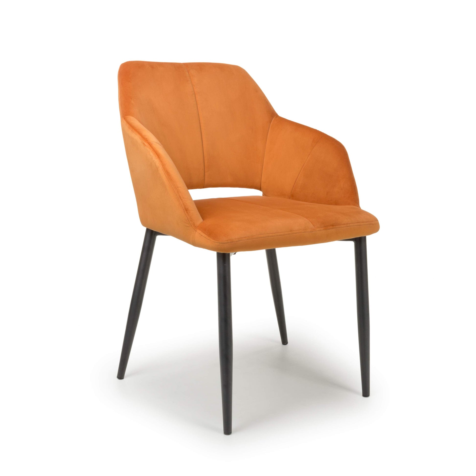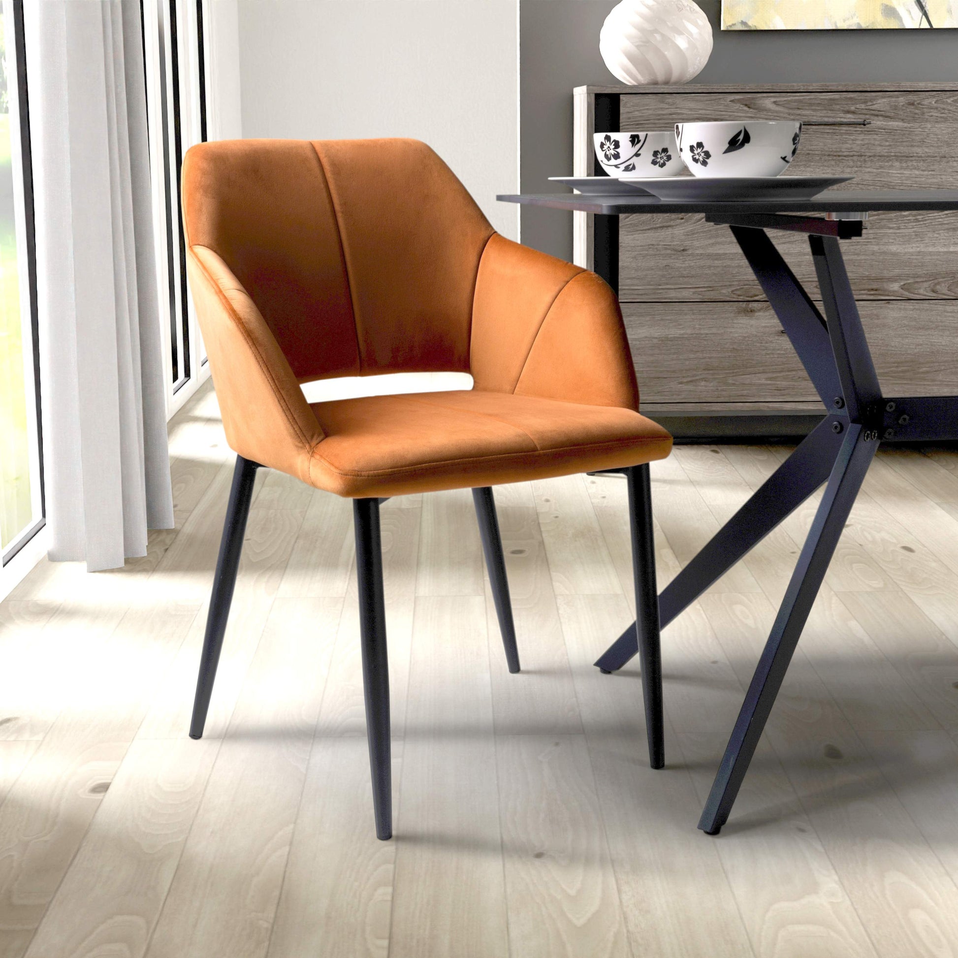 Elevate your dining space with our modern angular dining chair, available in vibrant burnt orange or refreshing lime brushed velvet.