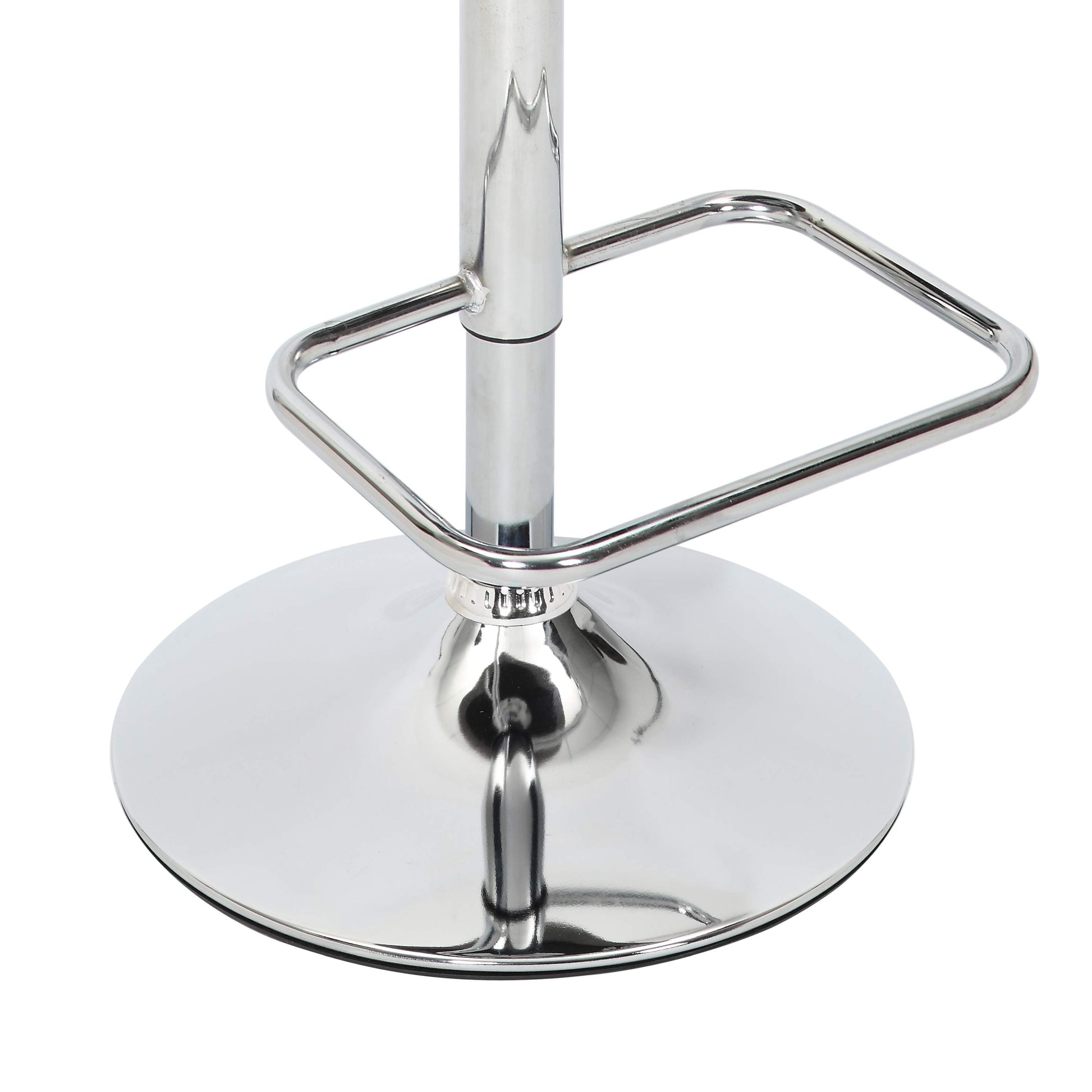 Each stool features a rounded chrome base, a rectangular footrest, and a gas lift mechanism offering height adjustment from 93cm to 113cm, ensuring the perfect fit for breakfast bars or kitchen islands. A 360-degree swivel seat adds function and flexibility, while the stylish design makes a bold statement in modern and minimalist interiors.