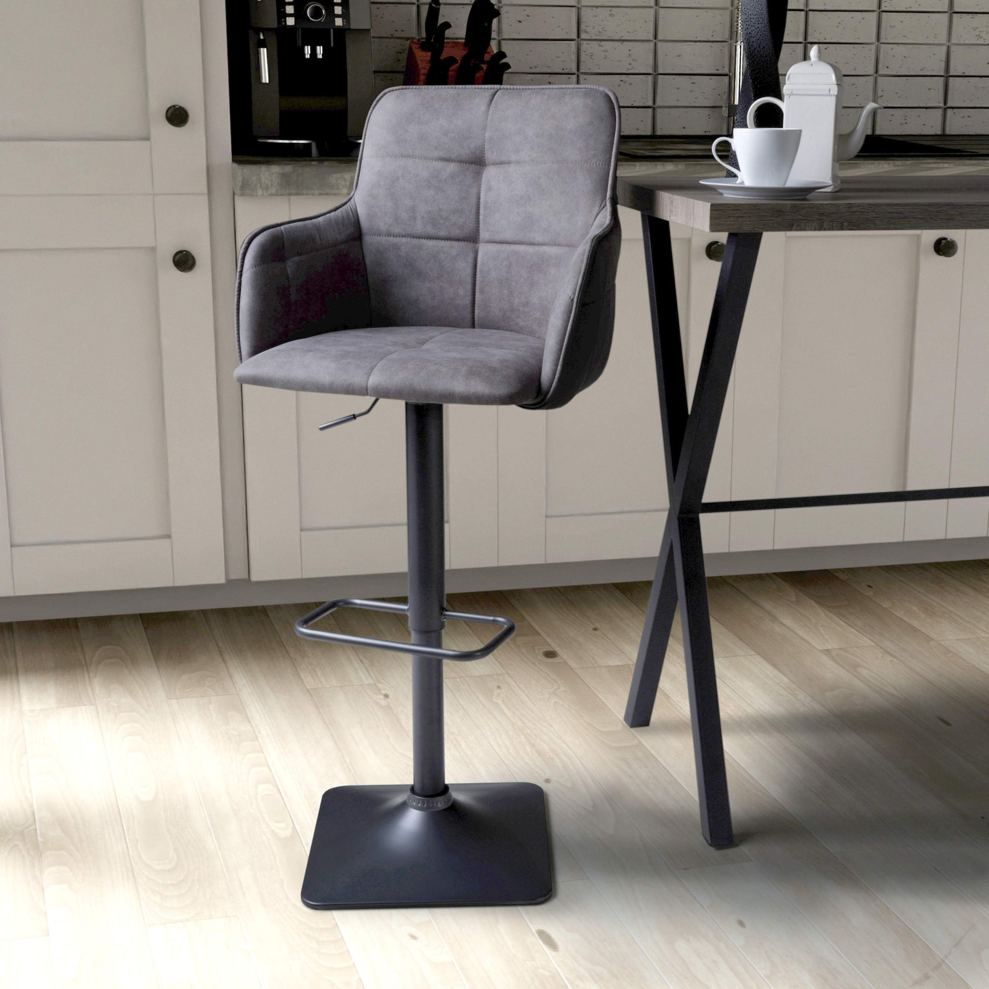 These bar stools feature a 360-degree swivel seat and adjustable height up to 120cm, offering personalised comfort for every space. The sturdy iron grey square base includes an integrated bar footrest for additional support and style.