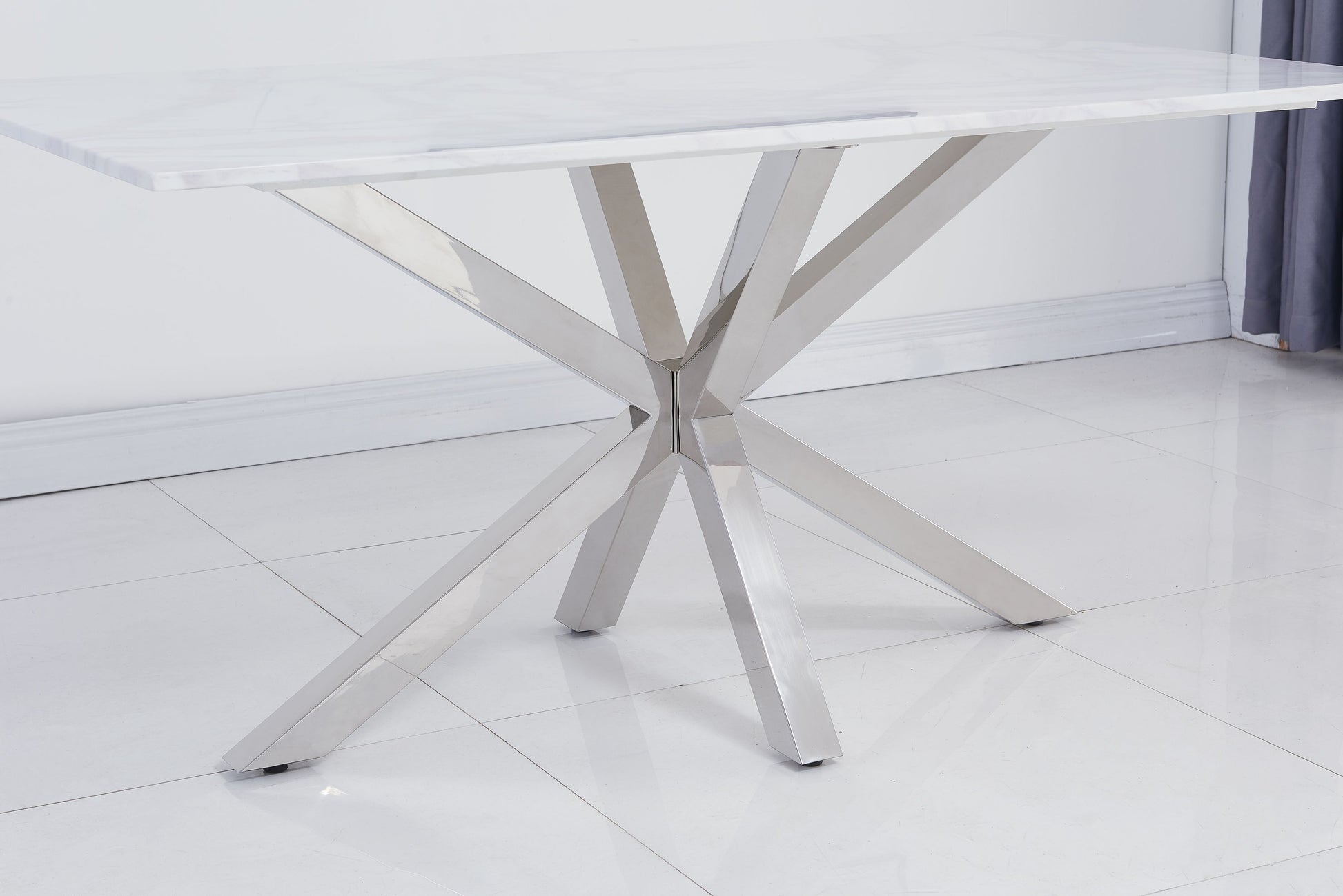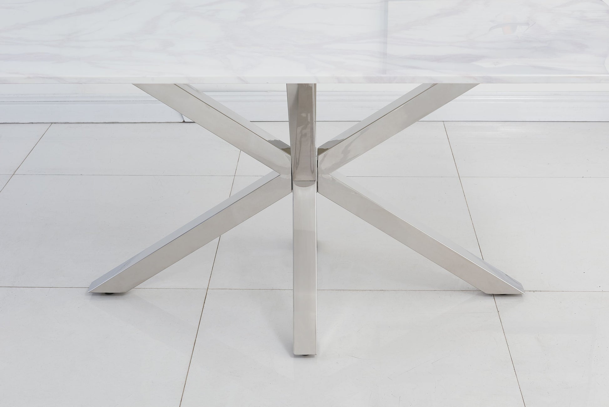 The River 1.6m White Calacatta Ceramic Marble Dining Table combines elegance with modern design. Featuring a sleek White Calacatta ceramic top with a chrome criss-cross base, it mimics the look of genuine marble while adding a touch of sophistication.
