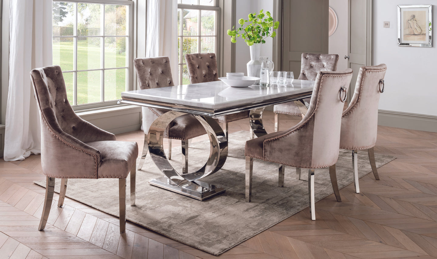 The Bell Dining Chair is a luxurious dining chair, expertly crafted with polished metal and brushed velvet. It is offered in 3 colour options: Pewter, Charcoal, and Champagne.